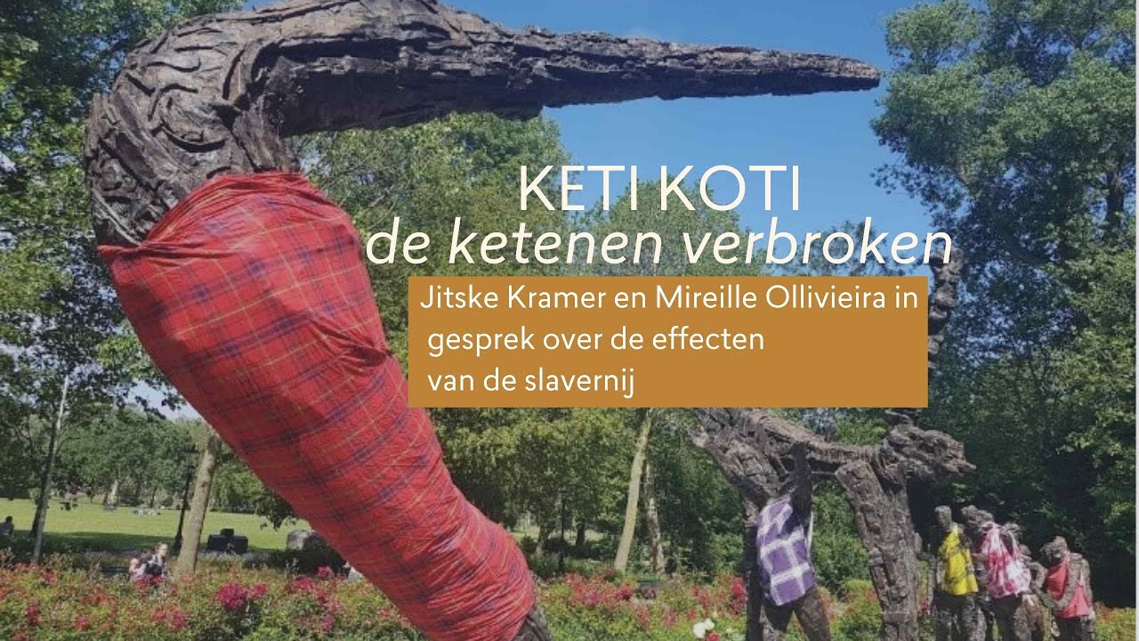 Jitske Kramer: Ik ervaar ‘m dubbel, ik was er niet bij bij dat stuk. Klopt, jij ook niet. Bij Keti Koti festival was ik een keer en was een van de weinige witte mensen die rondliep. En dat is toch een beetje dat je… ik merkte gewoon dat ik het best moeilijk vind een houding te geven met het stuk van de geschiedenis wat ik met mijn voorkomen met me meedraag, net als jij met jouw voorkomen een stuk van de geschiedenis meedraagt. Dus, samen dansen.. dus voor mij in het hier en nu, vier ik heel graag dat de geschiedenis een wending heeft gekregen. En dat we met elkaar kunnen gaan bouwen ook hoe wíj́ het met elkaar willen voor nu en de toekomst. Daar denk ik: yes, weetjewel, de ketens zijn eraf. En het besef dat er heel veel andersoortige ketens zijn, dat er op dit moment nog steeds mensen op allerlei plekken in de wereld in vormen van slavernij leven, daar wil ik graag bij stilstaan en daar mijn steentje aan bijdragen. Dus in het hier en nu en in de toekomst voel ik heel veel kracht en sámen. En dat stuk geschiedenis voelt voor mij altijd, vanuit mijn familieachtergrond, ik weet me niet zo goed een houding te geven.